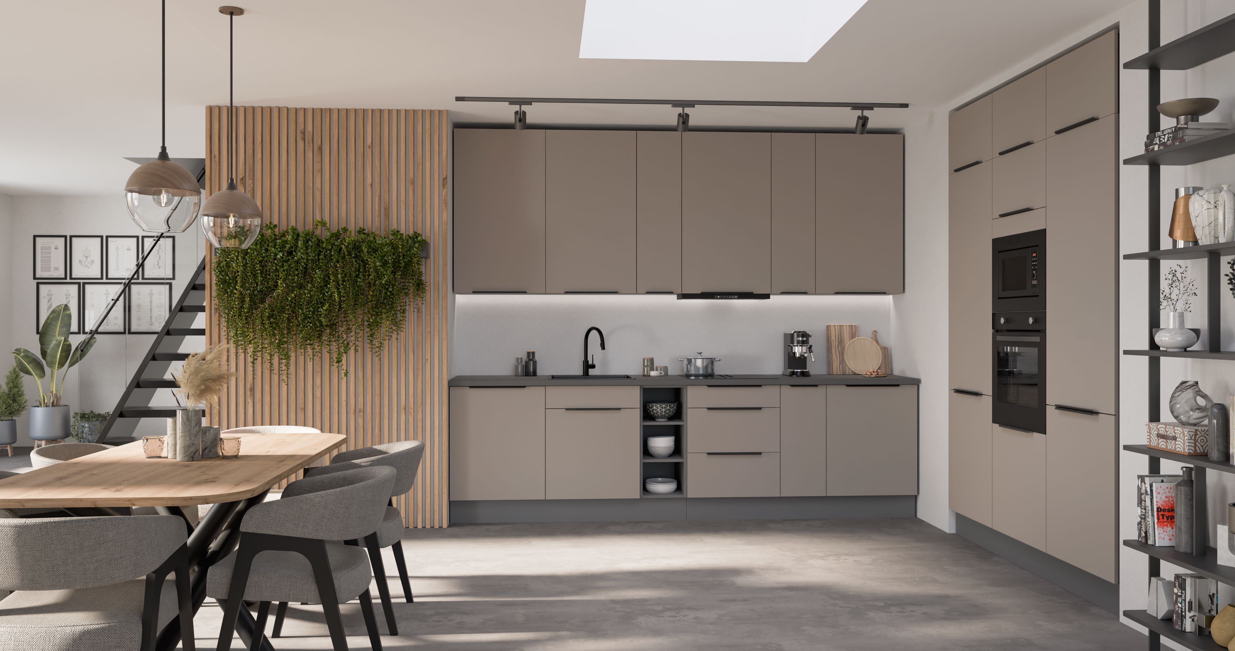 Wymiary: 600 x 2150 x 570 mm (szer. x wys. x gł.) Ilość paczek : 2 Front : - płyta laminowana 16 mm - Sandgrau AFM - obrzeże ABS 1 mm - Sandgrau AFM - uchwyt: metal czarny mat, rozstaw 320 mm, długość 360 mm - zawiasy z cichym domykiem Korpus : - płyta laminowana 16mm - antracyt - obrzeże melamina - antracyt Ściana tylna: - płyta HDF 2,5mm - biała
