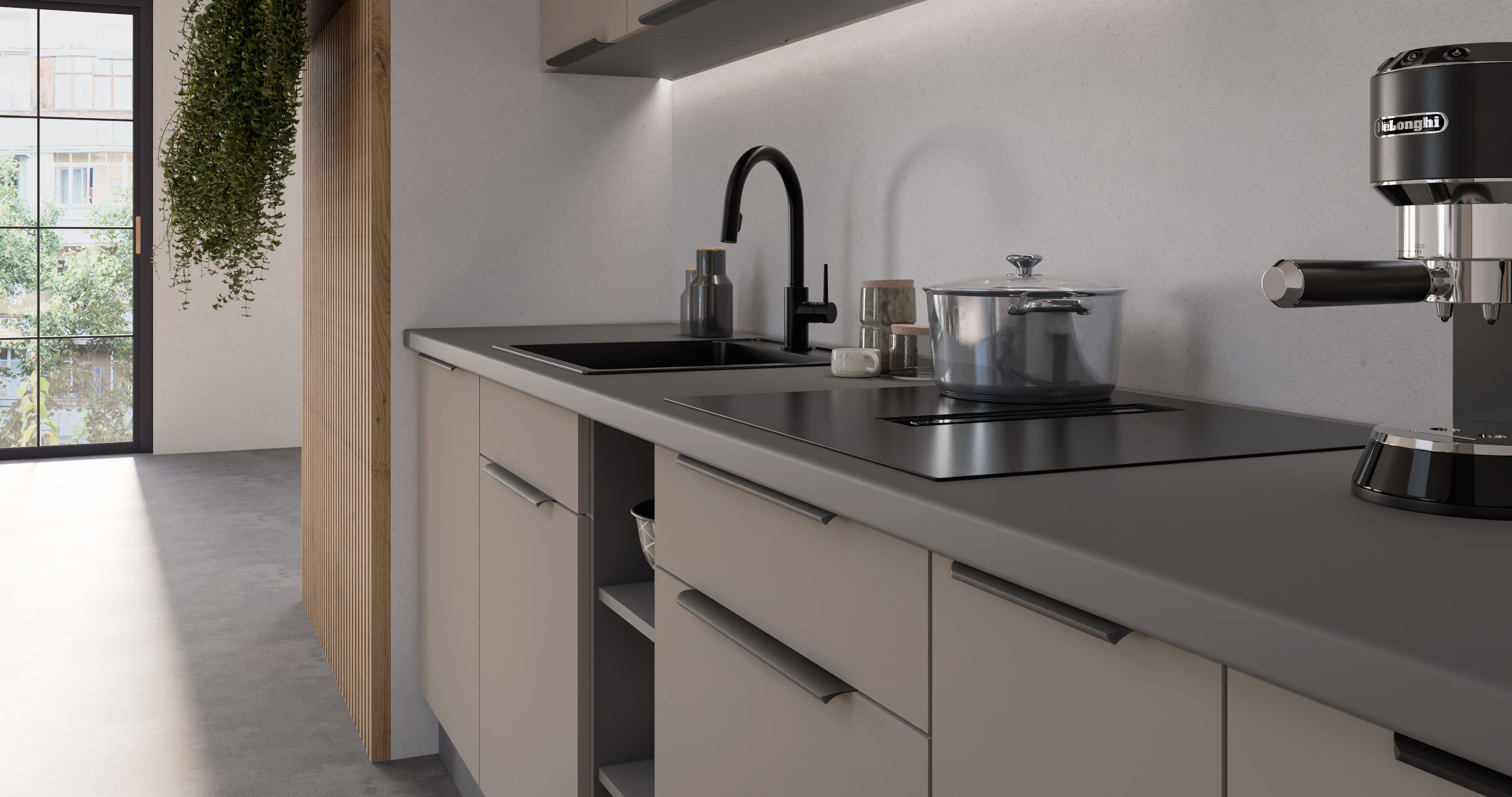 Wymiary : 150 x 870 x 520mm (szer. x wys. x gł.) Ilość paczek : 3 Front : - płyta laminowana 16 mm - Sandgrau AFM - obrzeże ABS 1 mm - Sandgrau AFM - uchwyt: metal czarny mat, rozstaw 64 mm, długość 96 mm Korpus : - płyta laminowana 16mm - antracyt - obrzeże melamina - antracyt Ściana tylna: - płyta HDF 2,5mm - biała