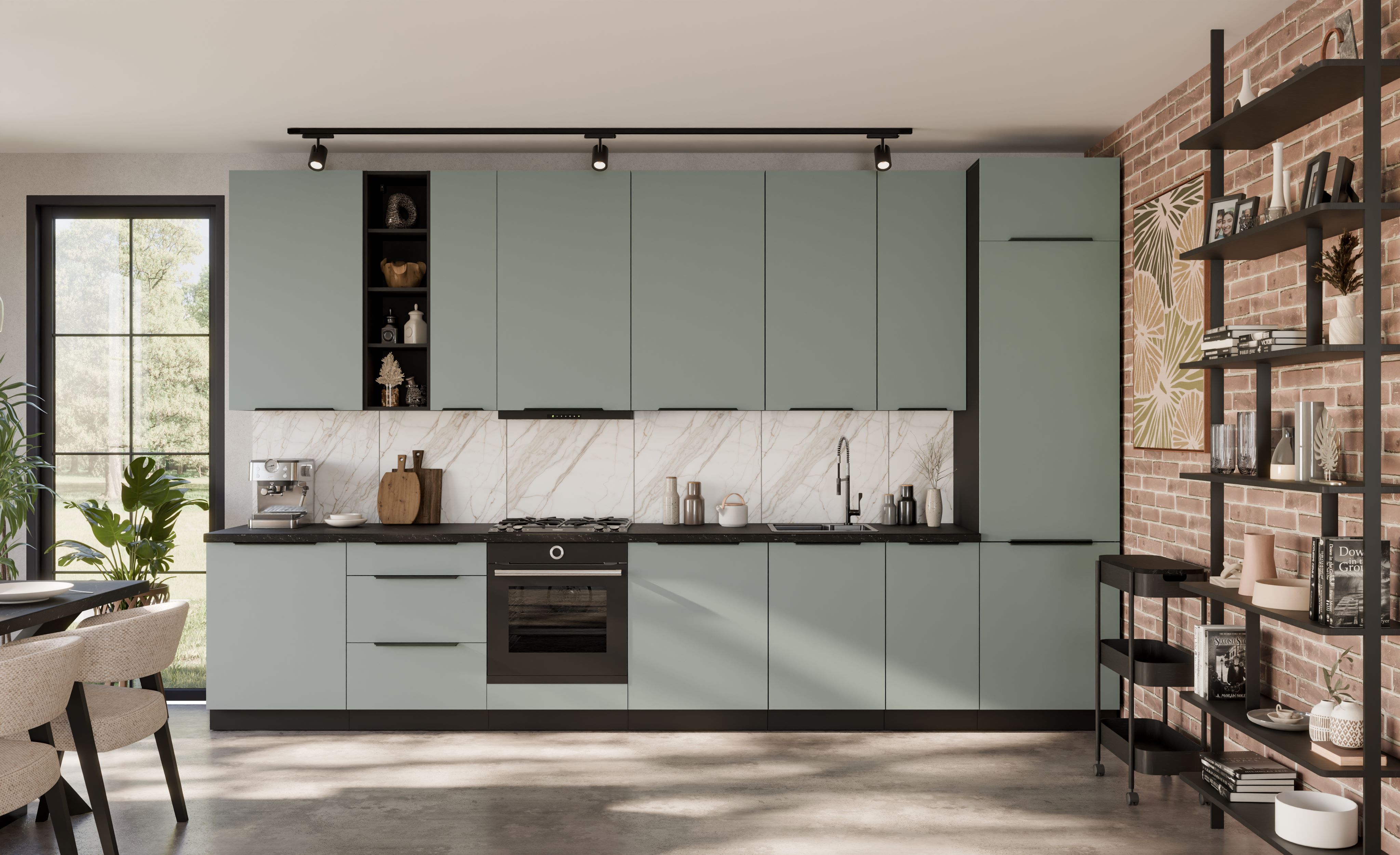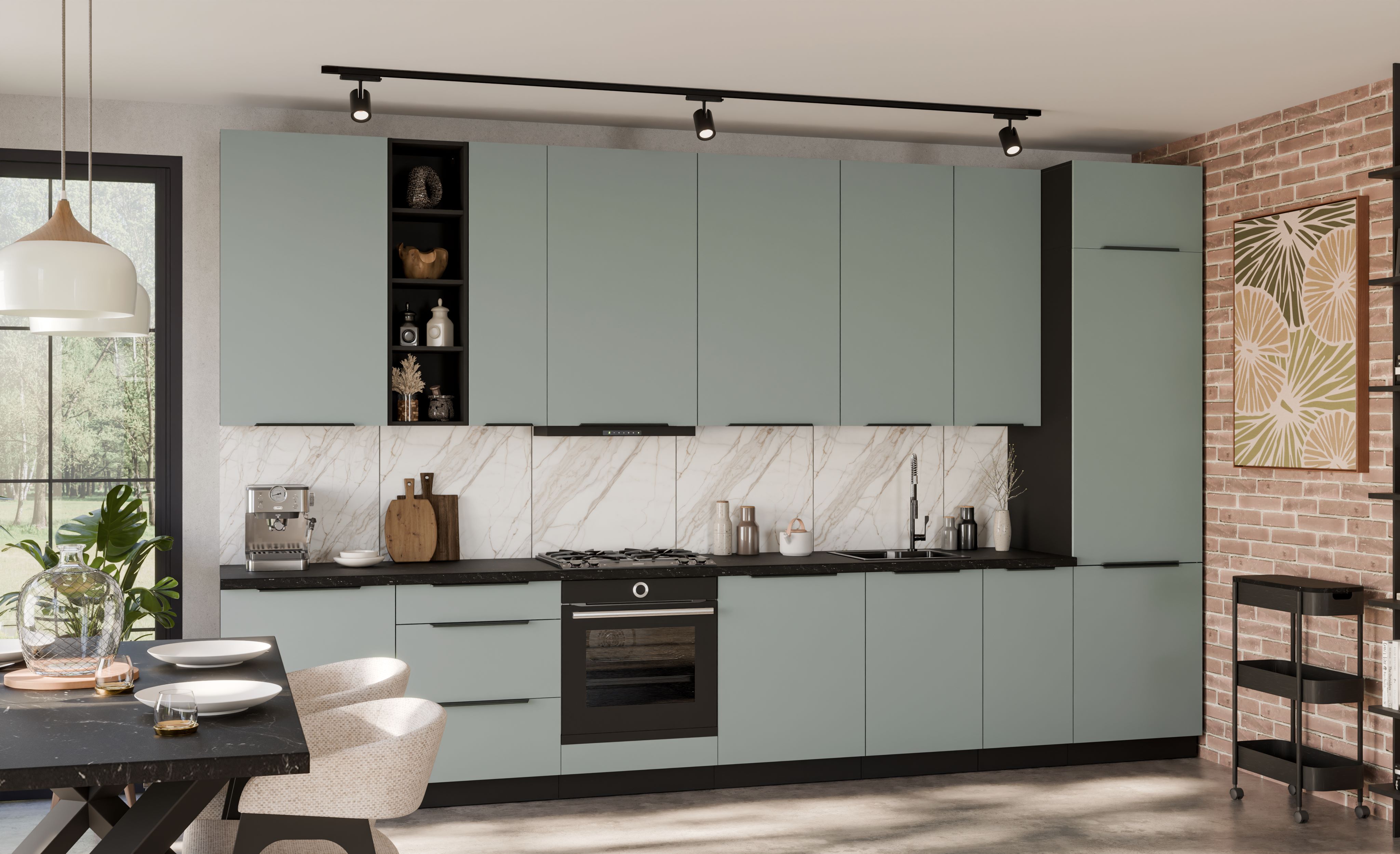 Wymiary: 300 x 1075 x 310 mm (szer. x wys. x gł.) Ilość paczek: 2 Front: - płyta laminowana 16 mm - Aquamarine AFM - obrzeże ABS 1 mm - Aquamarine AFM - uchwyt: metal czarny mat, rozstaw 160 mm, długość 190 mm - zawiasy z cichym domykiem Korpus: - płyta laminowana 16 mm - czarny - obrzeże melamina - czarny Ściana tylna: - płyta HDF 2,5mm - biała