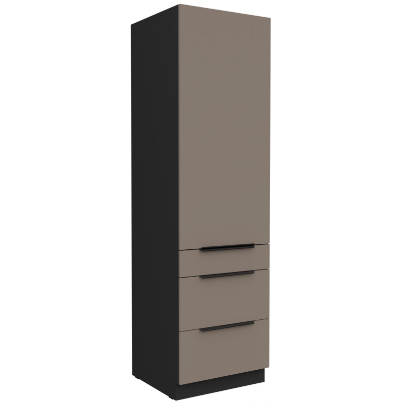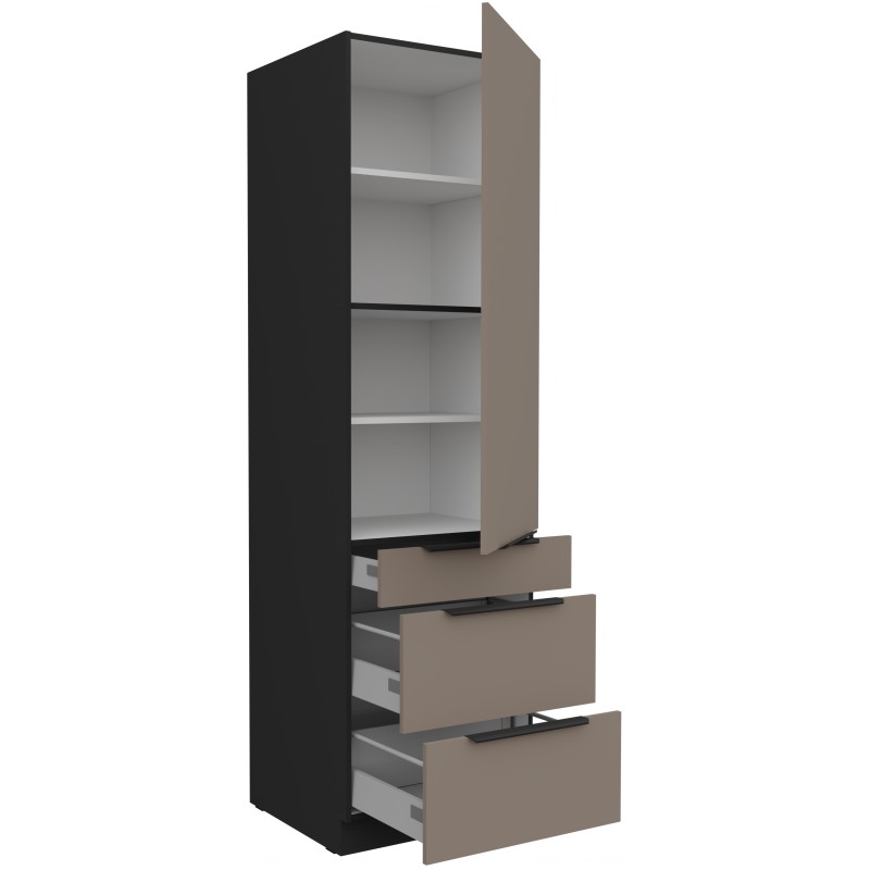 Szafka posiada jedne drzwi i trzy szuflady. Szafka ma trzy półki.