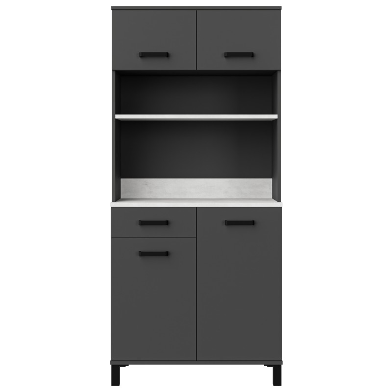Wnętrze szafki dolnej i górnej w kolorze antracyt / beton. Wnętrze szuflady w kolorze białym.