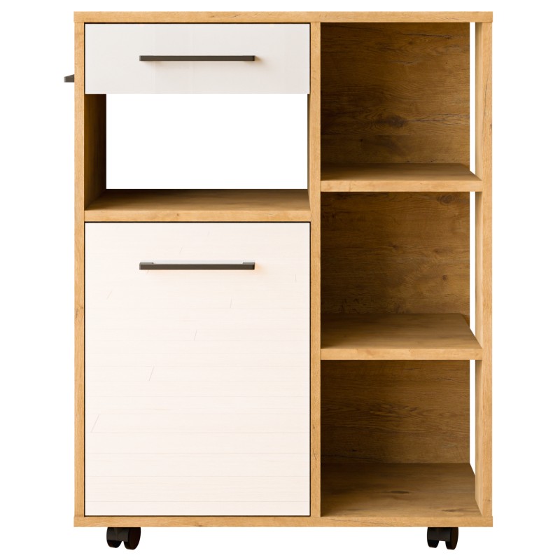 Szafka posiada jedne drzwi i jedną szufladę. Szafka ma trzy półki.