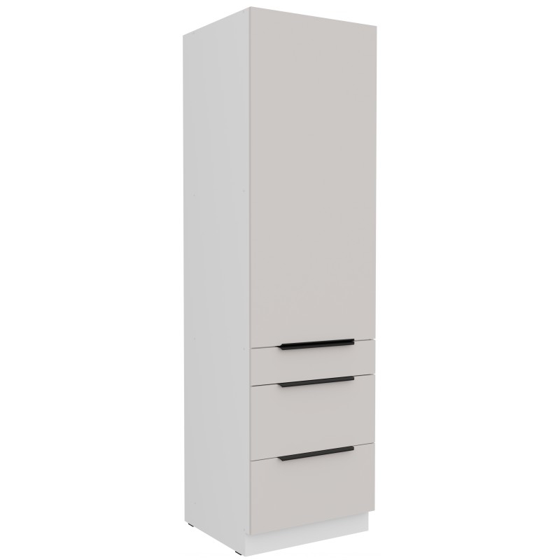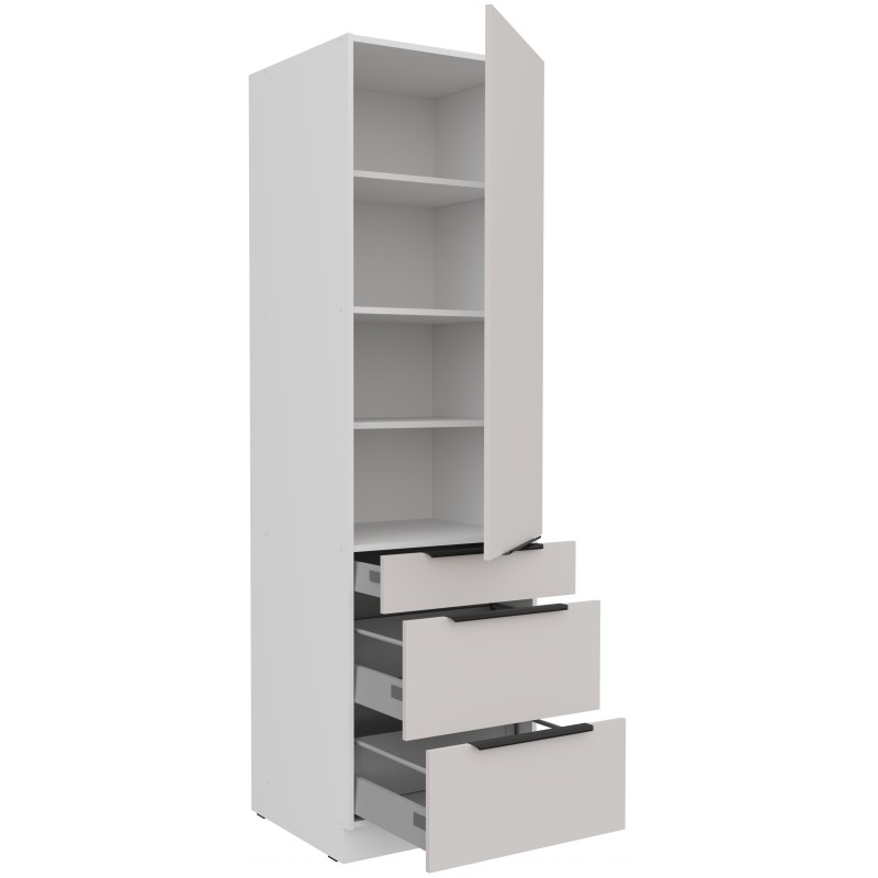 Szafka posiada jedne drzwi i trzy szuflady. Szafka ma trzy półki.